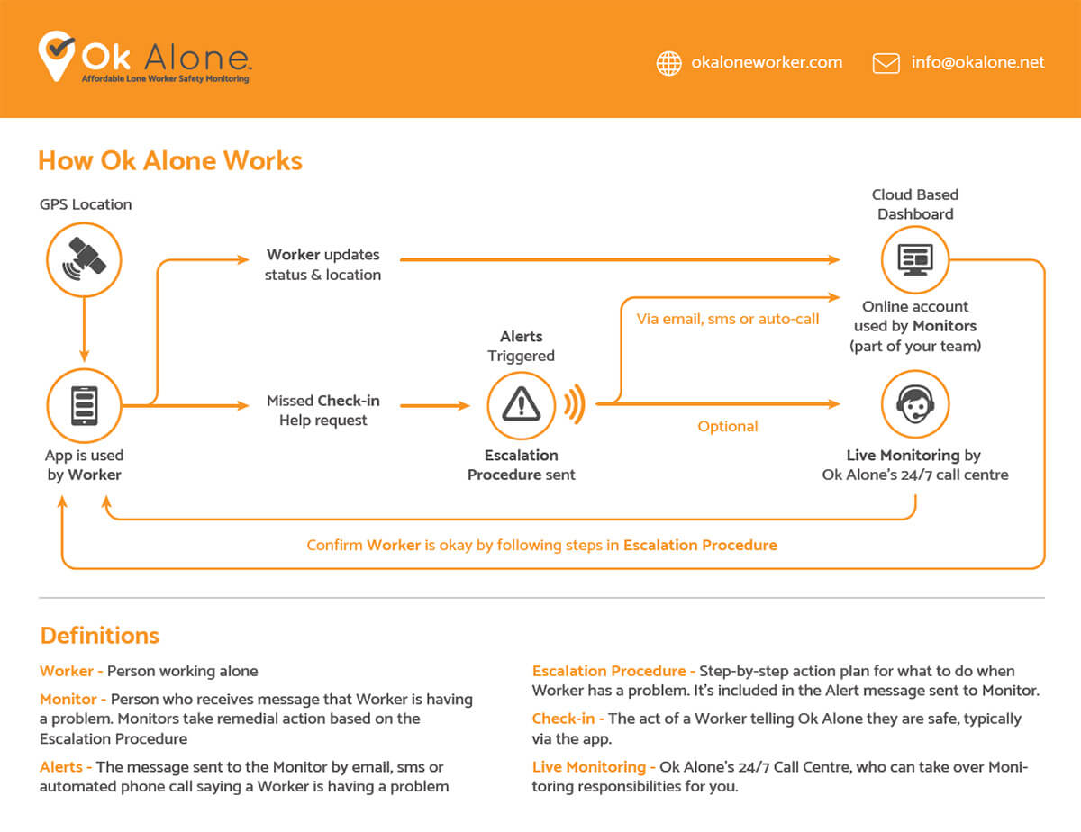 Here is a useful diagram explaining how the Ok Alone lone worker system works: